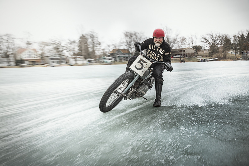 A frozen lake two hours from Milwaukee, Wisconsin. -17°C on the thermometer. Perfect conditions for the madcap Frozen Few, a group photo worthy of a Tarantino film, to go wild on their vintage Harleys from the 1930s. After the Race of Gentlemen organized in the summer by Bobby and Mel, something tells me there should be a cooler event in the works. Pure fun, tried and tested!