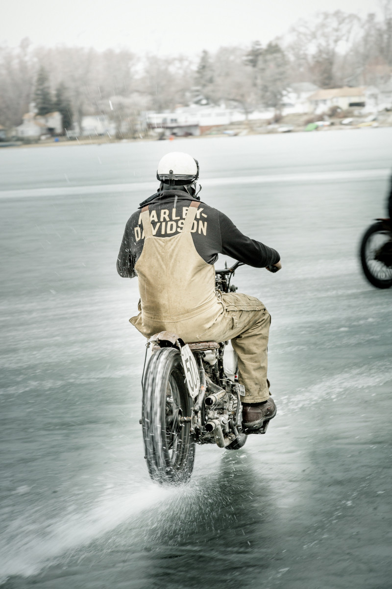 A frozen lake two hours from Milwaukee, Wisconsin. -17°C on the thermometer. Perfect conditions for the madcap Frozen Few, a group photo worthy of a Tarantino film, to go wild on their vintage Harleys from the 1930s. After the Race of Gentlemen organized in the summer by Bobby and Mel, something tells me there should be a cooler event in the works. Pure fun, tried and tested!