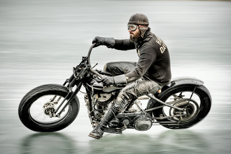 A frozen lake two hours from Milwaukee, Wisconsin. -17°C on the thermometer. Perfect conditions for the madcap Frozen Few, a group photo worthy of a Tarantino film, to go wild on their vintage Harleys from the 1930s. After the Race of Gentlemen organized in the summer by Bobby and Mel, something tells me there should be a cooler event in the works. Pure fun, tried and tested!