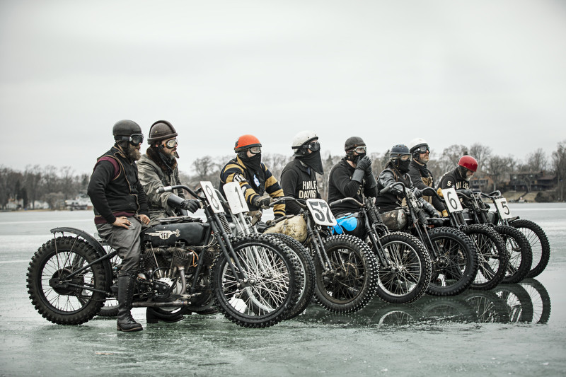 A frozen lake two hours from Milwaukee, Wisconsin. -17°C on the thermometer. Perfect conditions for the madcap Frozen Few, a group photo worthy of a Tarantino film, to go wild on their vintage Harleys from the 1930s. After the Race of Gentlemen organized in the summer by Bobby and Mel, something tells me there should be a cooler event in the works. Pure fun, tried and tested!